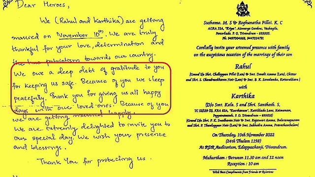 கேரளாவைச் சேர்ந்த தம்பதி நம் நாட்டின் எல்லை இருந்து எப்போதும் நம்மைக் காத்துக்கொண்டிருக்கும்ன் ராணுவ வீரர்களுக்கு மரியாதை செலுத்தும் விதமாக தங்களது திருமணத்துக்கு அழைப்பு விடுத்துள்ளனர்.