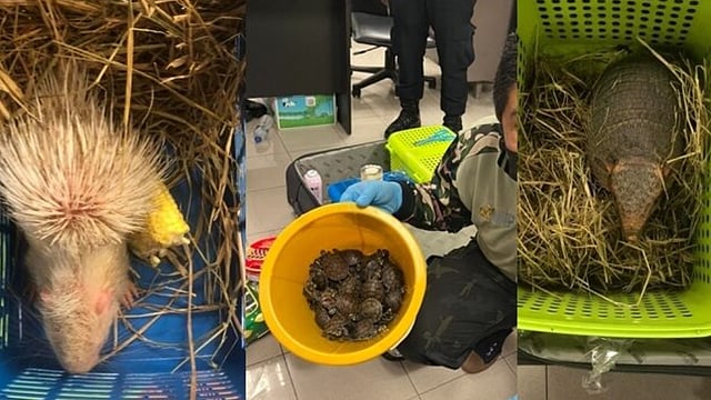 பின்னர் அவர்களின் சூட்கேஸ்களை பாதுகாப்பு அதிகாரிகள் திறந்து பார்த்தபோது, 50 பல்லிகள், 20 பாம்புகள், இரண்டு வெள்ளை முள்ளம்பன்றிகள், 35 ஆமைகள் உள்ளிட்ட 109 விலங்குகள் உயிருடன் இருந்துள்ளன.