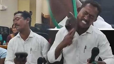 நர்சிபட்டினம் வார்டு 20 கவுன்சிலர் எம்.ராமராஜு. திங்கள் அன்று நடந்த கவுன்சில் மீட்டிங்கில் இந்த விநோத செயலில் ஈடுபட்டுள்ளார்.