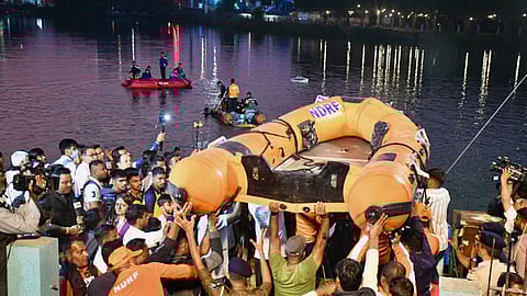 குஜராத் மாநிலம் வதோதரா நகரின் உள்ள ஏரியில் ஆசிரியர்களும், மாணவர்களும் படகு சவாரி செய்துள்ளனர்.
