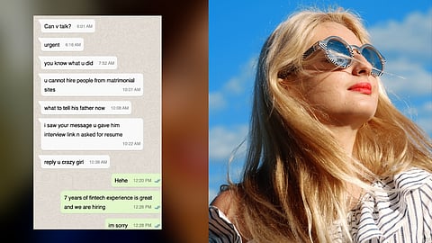 அந்த மெஸ்ஸேஜில் கோவமான அவரது தந்தை. “உடனடியாக உன்னுடன் பேச வேண்டும், பைத்தியக்கார பெண்ணே, நீ என்ன செய்ற தெரியுமா?. மெட்டரிமொனியல் சைட்டில் வேலைக்கு ஆள் எடுக்கக் கூடாது, அந்த பையனின் அப்பா கிட்ட என்ன சொல்லுறது? நீ இன்டர்வியூ லின்க் அனுப்பி அவர் கிட்ட ரெஸியூம் கேட்டதை பாத்தேன்” என வரிசையாக மெஸ்ஸேஜ் அனுப்புகிறார்.