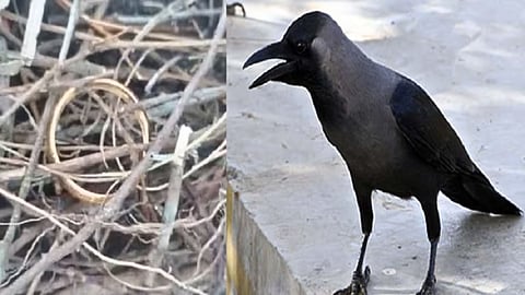 தென்னை மரத்தில் கூடு கட்டியுள்ள காகம் இதுபோன்று பொருட்களை எடுத்து வந்து கூட்டில் சேர்ப்பதாக பக்கத்து வீட்டுக்காரர் கூறியிருக்கிறார். இதனை அடுத்து அந்த கூட்டில் தேடிய போது மற்ற தங்க நகைகள் கிடைத்துள்ளன.