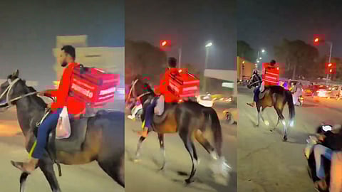 சோமோட்டோ ஊழியர் ஒருவர் குதிரையில் சவாரி செய்தபடி வாடிக்கையாளர்களுக்கு உணவுப் பொருட்களைக் கொண்டு சேர்க்கும் வீடியோ இணையத்தில் வைரலாகி வருகிறது.