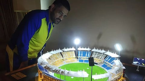 ரசிகர்கள் தங்கள் 'தல' தோனிமீது பல வகைகளில் அன்பை வெளிக்காட்டி வருகின்றனர். அந்த வகையில் ரசிகர் ஒருவர் சிறிய அளவில் சேப்பாக்கம் மைதானத்தின் மாதிரியை செய்து தோனிக்கு அன்பழிப்பாக வழங்கியுள்ளார்.