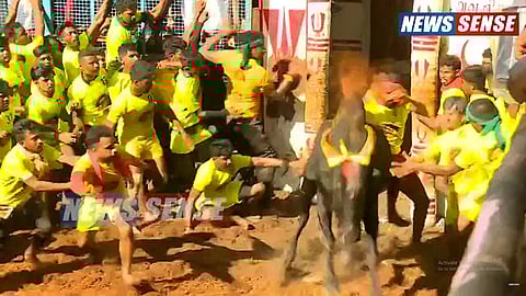 திமிலில் கருப்பு, உடலில் வெள்ளை மஞ்சள் பூசிய கொம்புடன் வாடிவாசலில் தயங்கி நின்றது காளை. வெளி வந்ததும் மூன்று இளைஞர்கள் அதன் மீது ஏறி விழ லேசாக உடலை ஆட்டியது இரண்டு பேர் வழுக்கி விழ அடுத்த துள்ளலில் மூன்றாவது ஒருத்தர் குப்புற விழுந்தார். வெற்றிகரமாக வீரர்களை வென்று களத்தைத் தாண்டியது.