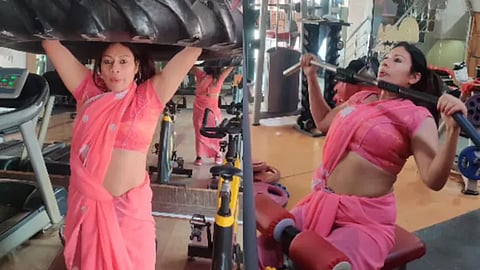 இன்ஸ்டாவில் வைரலாகி வரும் வீடியோ ஒன்றில் பெண் ஒருவர் சேலை உடுத்திக்கொண்டே ஜிம்மில் கடினமான உடற்பயிற்சிகளைச் செய்கிறார்.