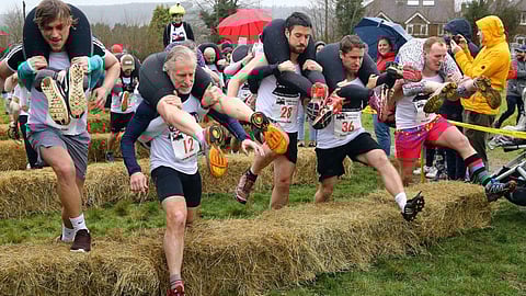 254 மீட்டர் நீளமான இந்த ஓடுதளத்தில் தம்பதிகள் தடைகளைக் கடந்து ஓட வேண்டும். பங்கேற்பாளர்களில் பெண்ணின் எடை 49 கிலோகிராமுக்கு அதிகமாக இருக்க வேண்டும்.